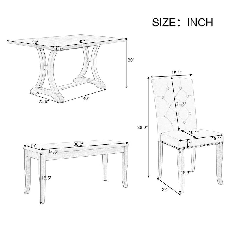 Ensemble de salle à manger de style campagnard 6 pièces pour 6 personnes - Table rectangulaire à tréteaux avec chaises et banc