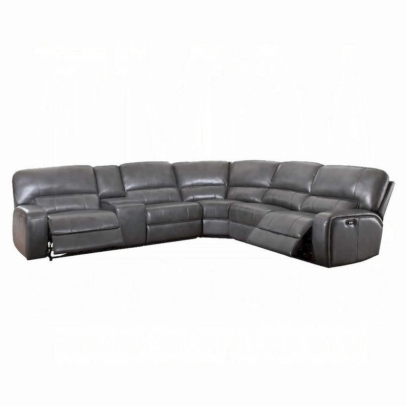 Canapé d'angle Saley à mécanisme électrique, port USB, similicuir gris, console